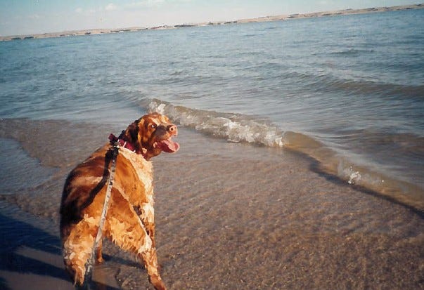 Once, when Abby was hunting quail with us, she came across an especially rank-smelling animal corpse by the side of a stream. Abby being Abby, she of course was going to roll in it, and we’d have to bathe her later. It wasn’t until she rolled once and yelped in pain that we saw what kind of dead animal she was rolling in.
